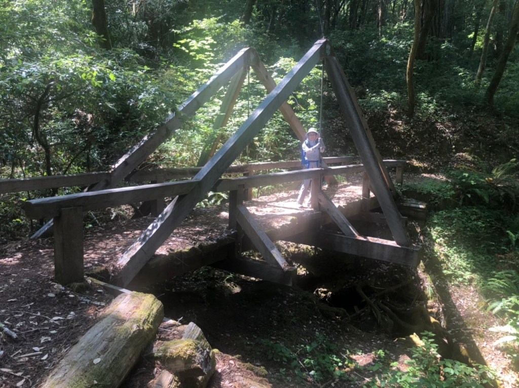 The Miller Creek bridge on the Johnson Camp Trail was destroyed by a falling redwood several years ago and has not been replaced, but it’s not difficult to traverse the dry creek bed. However in springtime be prepared to take your boots off and wade across. A winter crossing may not be safe. The other bridge on the trail, shown here, is intact. I had to admire the simplicity and effectiveness of this simple suspension bridge design.