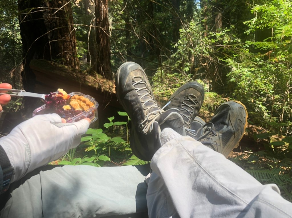 For a wonderful 13 mile / 1500 ft gain loop hike, try this route (reference this map): starting on Mattole Road, just past the turn off to the Albee Creek Campground, park just beyond the bridge and take the fire road gradually uphill towards Grasshopper peak. After gaining about 1,200 ft you will come to the junction at the start of the Johnson Trail Camp trail. Take that trail (For extra credit do a challenging out-and-back up to Grasshopper Peak!) and enjoy a beautiful mostly level path through the forest back down to the Rockefeller Grove of redwoods along Bull Creek. We enjoyed a peaceful lunch on the trail.