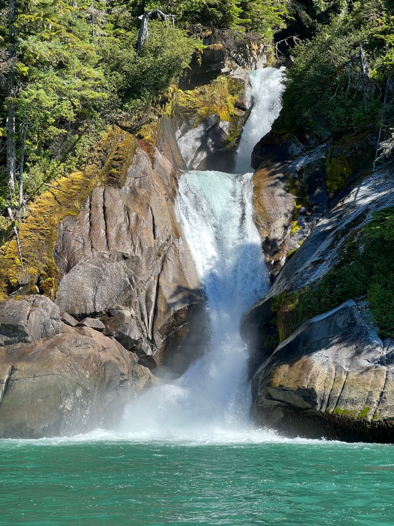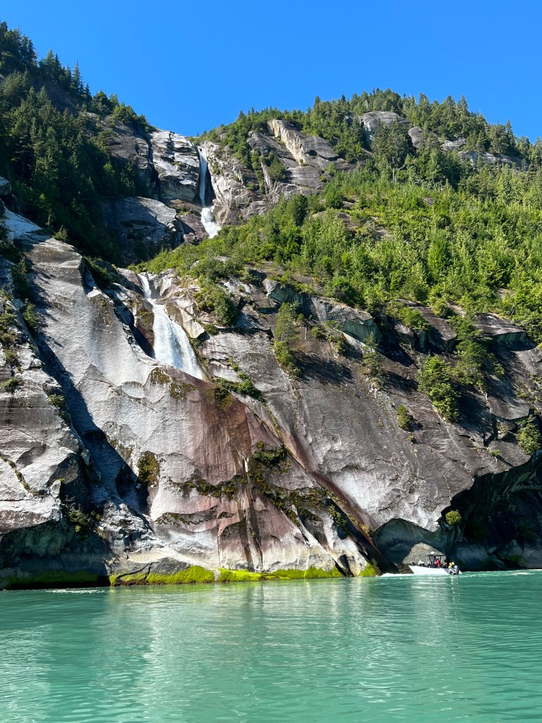 The glacial melt made the water green, and fed an astonishing number of waterfalls along the Gardner Canal passage in an area the crew called “Waterfall Way”, in the Kitlope region.