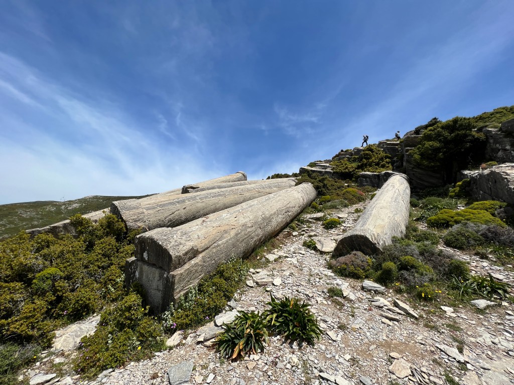 In Roman Imperial times, Carystus was well known for its many quarries where green cipollino marble was cut and exported for use as building material, even as far away as the Augustan era Forum in Rome. Our hike route led us uphill to a remarkable sight; massive marble columns, completely separated from the rocky hillside they were cut out of, but abandoned before they would have been moved many kilometers down to the ocean to the ships waiting to transport them away. Regardless, many such columns were probably quarried from here prior to these few that remained.