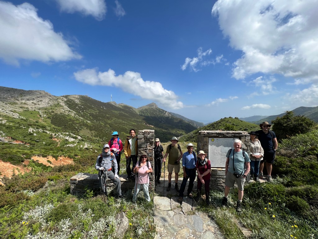 The most scenic hike on the island of Evia is from Petrokanalo Pass on Mt Ochi down through the Dimosari Gorge to Kallianu Beach. Our tour bus took us on the long drive up to the pass using the rough dirt roads constructed for the wind turbine farm. At the start of the trail our guide Stefanos took a group photo; Mt Ochi is behind him. The weather was perfect.