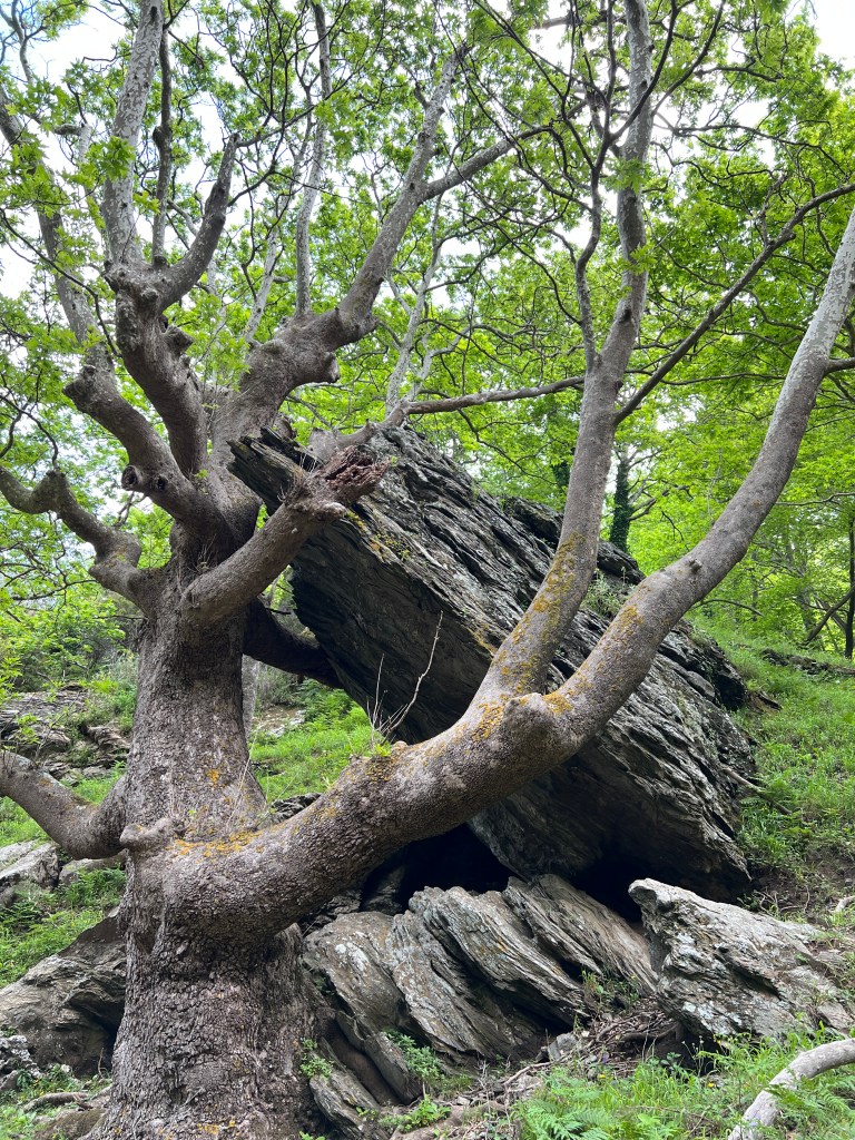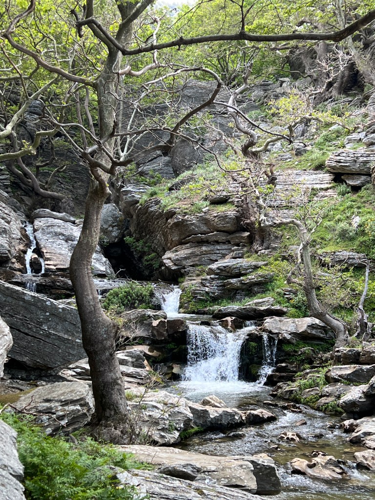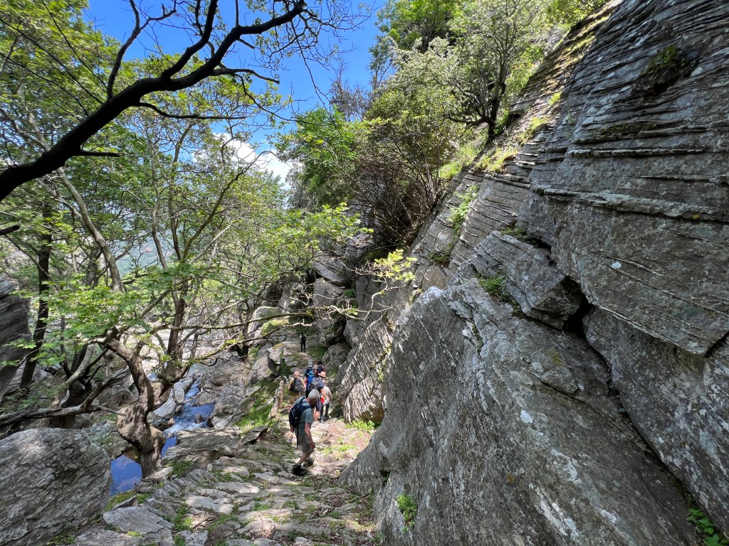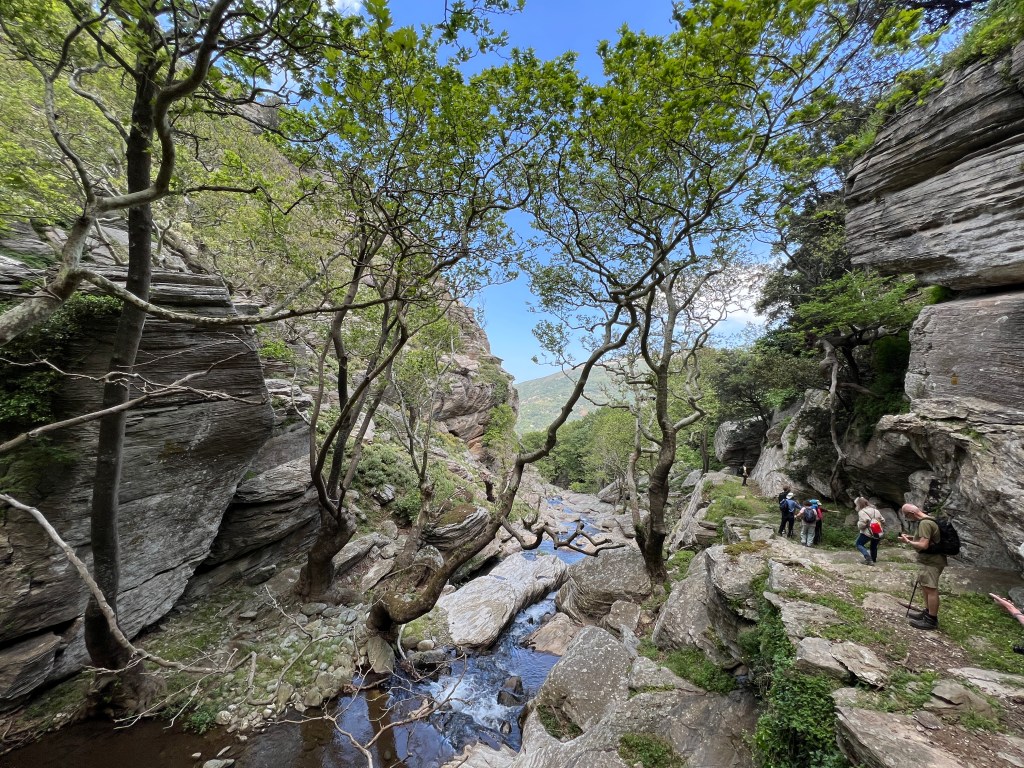 The trail is very old, likely dating back a few thousand years, and connects the the north shore of Evia to the Karystos area. It follows a stream which then turns into a small river, carved out of the rock and surrounded by thick vegetation featuring huge plane trees, which in North America would be called sycamores (genus Platanus).
