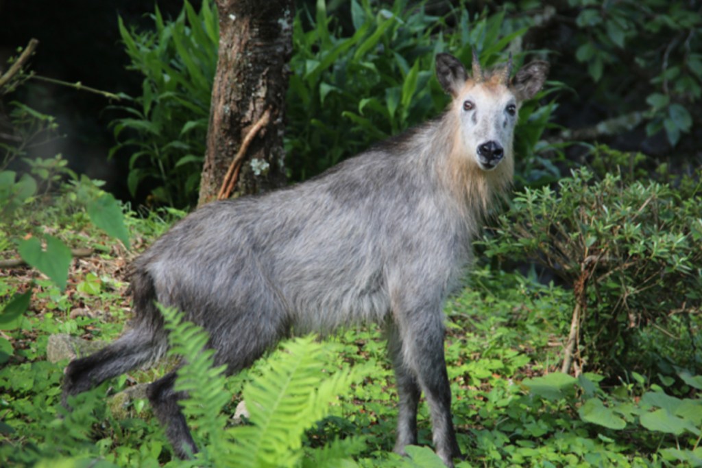When hiking with a group I often like to walk in front to improve my chances of spotting something shy and interesting. This approach was unexpectedly rewarded one day when I briefly locked eyes with a 1m tall Japanese serow or kamoshika which is distantly related to goats and sheep but distinctly different. It was only about 7m (22 ft) away from me in the shade but no vegetation was between us and its appearance was so different from anything I had seen before that I was momentarily disoriented. We stared at each other, and then as I reached from my phone to take a photo, the sound of Velcro separating on my phone holder likely caused it to turn and bound off into the forest. There are many photos of Serows available online, so I am borrowing this one from a Japanese government national park website.